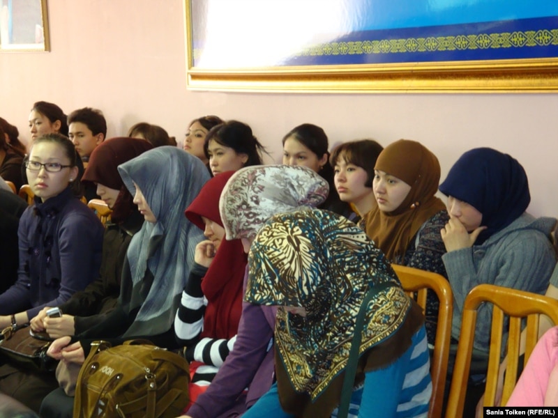 Девушки в платках сидят на встрече с представителями духовенства в Атырауском университете. 10 марта 2011 года.