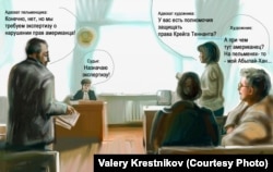 Фото рисунка одного из заседаний суда Петропавловска по делу художника Валерия Крестникова против предпринимателя Максима Калинина. Фото предоставлено Валерием Крестниковым. Петропавловск, февраль 2011 года.