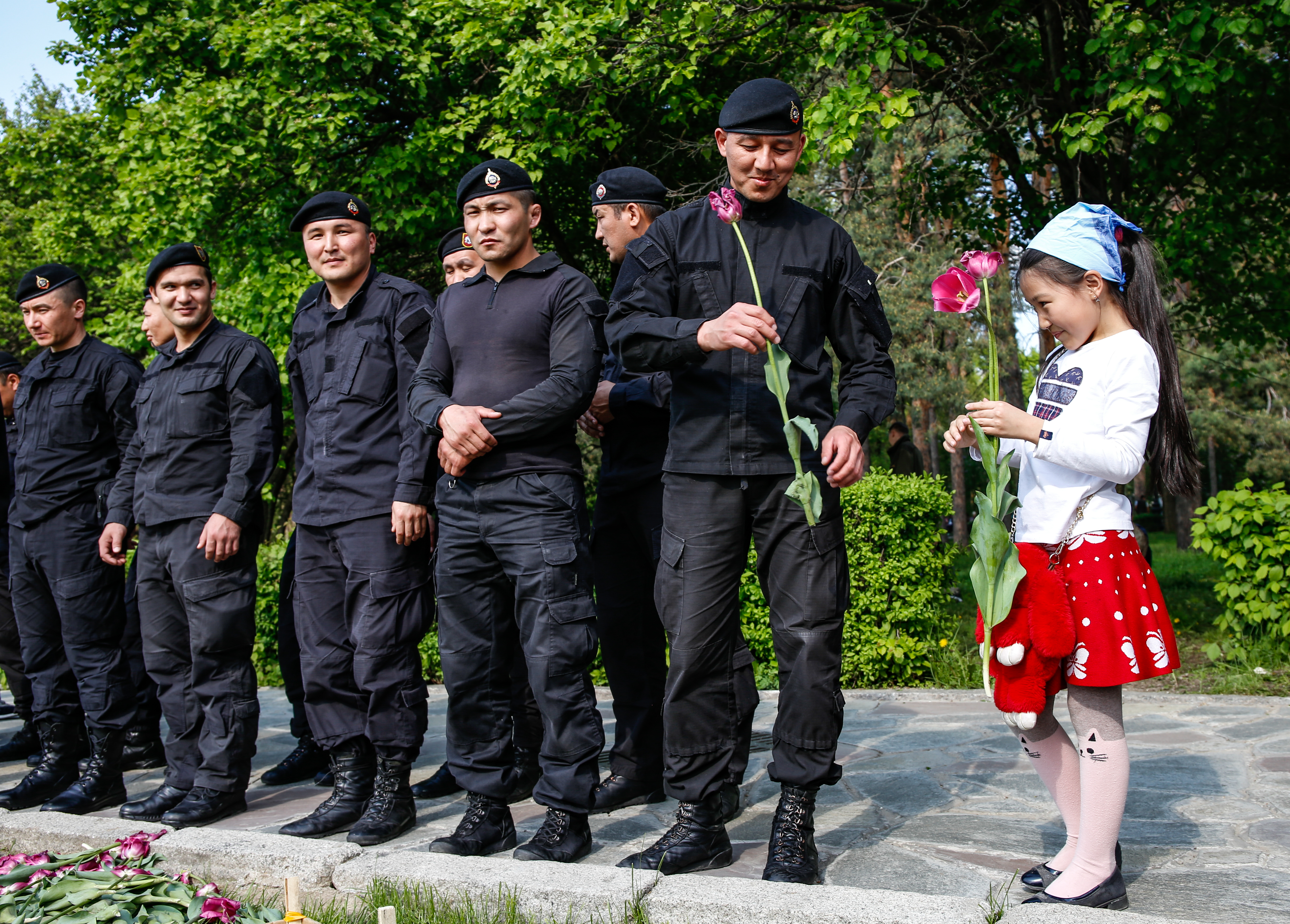 Одна из женщин протянула своей дочке охапку тюльпанов со словами: «Подари дядям». Та побежала раздавать цветы.
