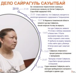 В августе 2018 года казахстанский суд признал Сайрагуль Сауытбай виновной по делу о незаконном пересечении государственной границы. Показания Сауытбай в суде пролили свет на факты притеснений представителей исповедующих ислам уйгуров, казахов, кыргызов и представителей других коренных общин Синьцзяна. На фоне внимания широкой общественности к делу Сауытбай казахстанский суд не стал ее депортировать в Китай и освободил из-под стражи, назначив шесть месяцев ограничения свободы с установлением пробационного контроля. В июне 2019 года Сауытбай, не добившись убежища в Казахстане, вылетела с семьей в Швецию.