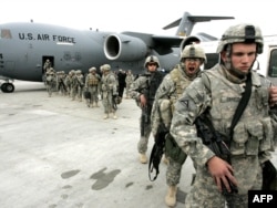 Американские солдаты выходят из самолета, прибывшего из Афганистана. Авиабаза "Манас", 26 февраля 2009 года.